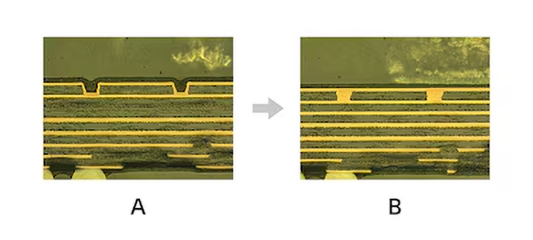 Bảng mạch in sử dụng vật liệu điện môi thấp để nhận diện truyền tải tín hiệu chính xác, trong khi các lỗ via holes được lấp đầy đồng để giảm thêm trở kháng. Kết quả là âm trường rộng với âm thanh trong trẻo, rõ ràng. [A] Lỗ via bình thường [B] Lỗ via lấp đầy